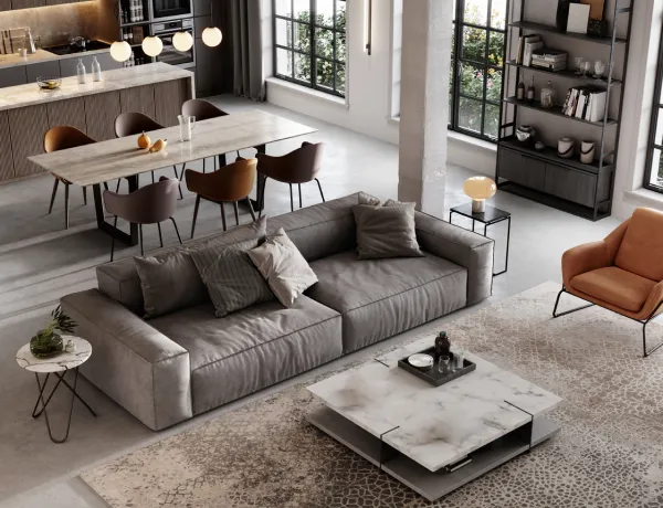 Вместо громоздкого дивана в гостиной лучше выбрать компактный модульный вариант, который легко превращается в дополнительное спальное место, а также раздвижной стол со стульями для обеденной зоны.