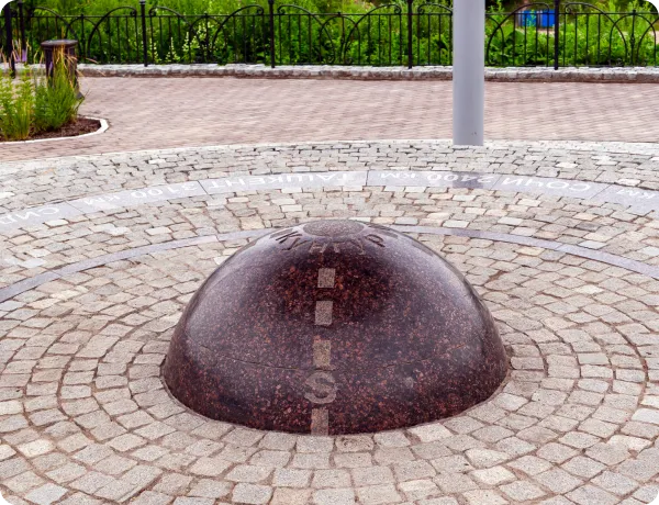 На розовой полусфере из мрамора изображена роза ветров. Вокруг неё – гранитные кольца, где указано расстояние до разных городов России и мира. Как выбирали города – загадка. Наряду с мировыми столицами вроде Парижа и Рима в списке есть Сочи и Чикаго.