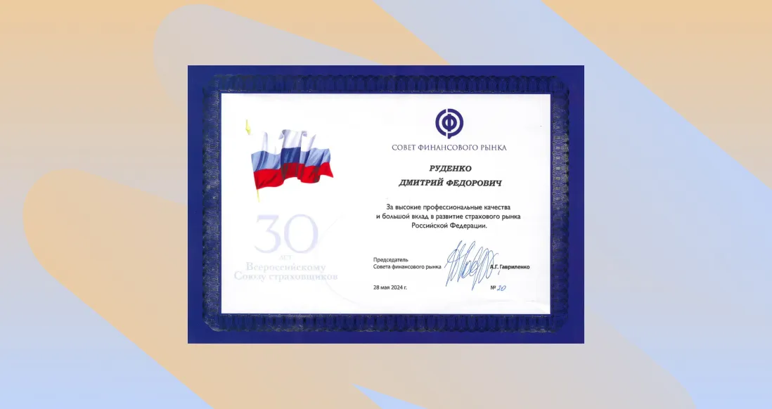 29 мая 2024 года на Общем собрании Всероссийского союза страховщиков (ВСС) генеральный директор компании «Абсолют Страхование» Дмитрий Руденко получил награду за высокие профессиональные качества и большой вклад в развитие страхового рынка Российской Федерации. Почетный диплом для Д. Ф. Руденко подписал председатель Совета финансового рынка А. Г. Гавриленко.